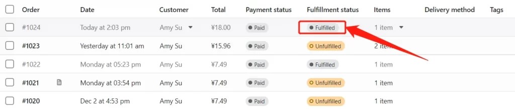 The app can now immediately mark the order “Fulfilled” on the Shopify menu in the Fulfillment Status column.