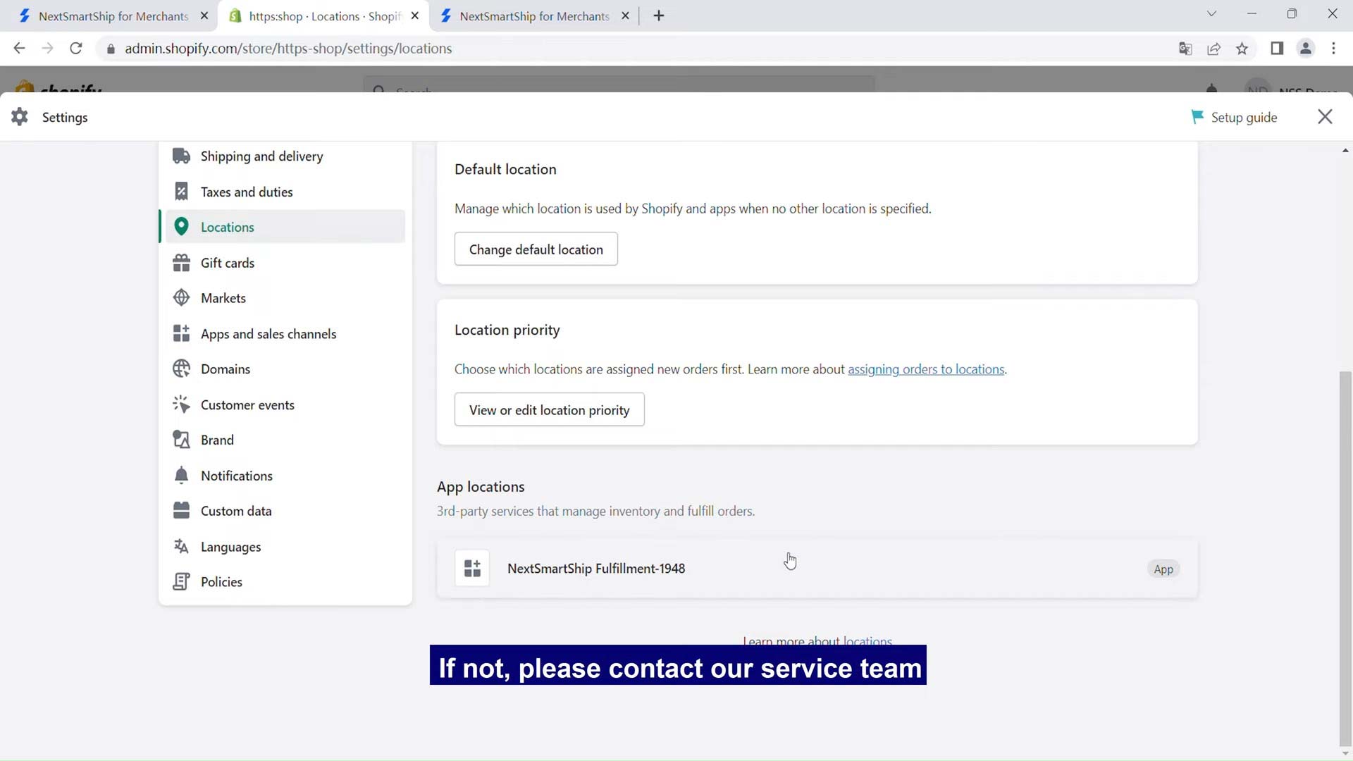 - Once this is done, you can go to the settings menu of Shopify and go to locations. There, you will see App Locations and will have NextSmartShip show up as your fulfillment option.